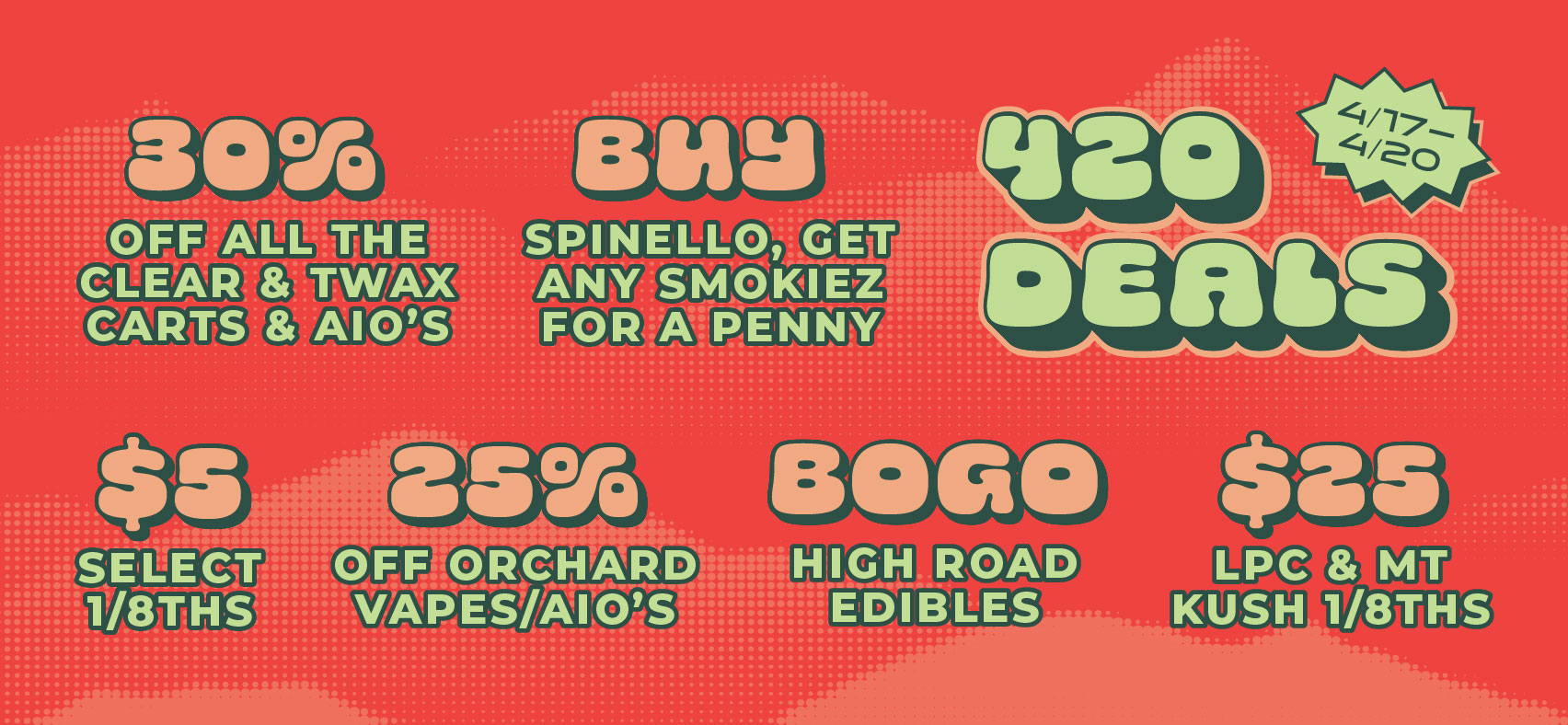 Lone Peak Cannabis Co. is your home base for 4/20 in Big Sky. Deals run April 17 through 20 — but the doorbuster Soultonix eighths are strictly while supplies last, so get here early. See you on the mountain. 🌿